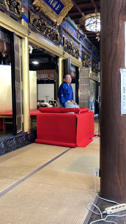 勤行が終わり、境内では浪花堂のご主人が開店準備をされるなか、本堂では素浄瑠璃の舞台準備。毛氈を引いて背後には金屏風、マイクも設置して、いざ素浄瑠璃です。ベースかと思うくらい弦の太そうな、鶴澤師匠の重厚な三味線の音色に合わせ、太夫さんである福岡さんの語りが進んで行きます(トップページの画像)とても迫力と実感のある一ノ谷嫰軍記のステージでした。