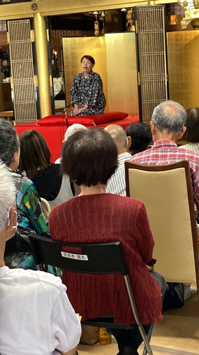 すばらしい落語を二席聞かせていただいて、続いて川村妙慶先生のお話です。ご自身のインターネット上での活動や、身の上のお話など、共感できるありがたいお話でした。聴聞された方々も、喜びと感動をいただいてお帰りになられたと思います。